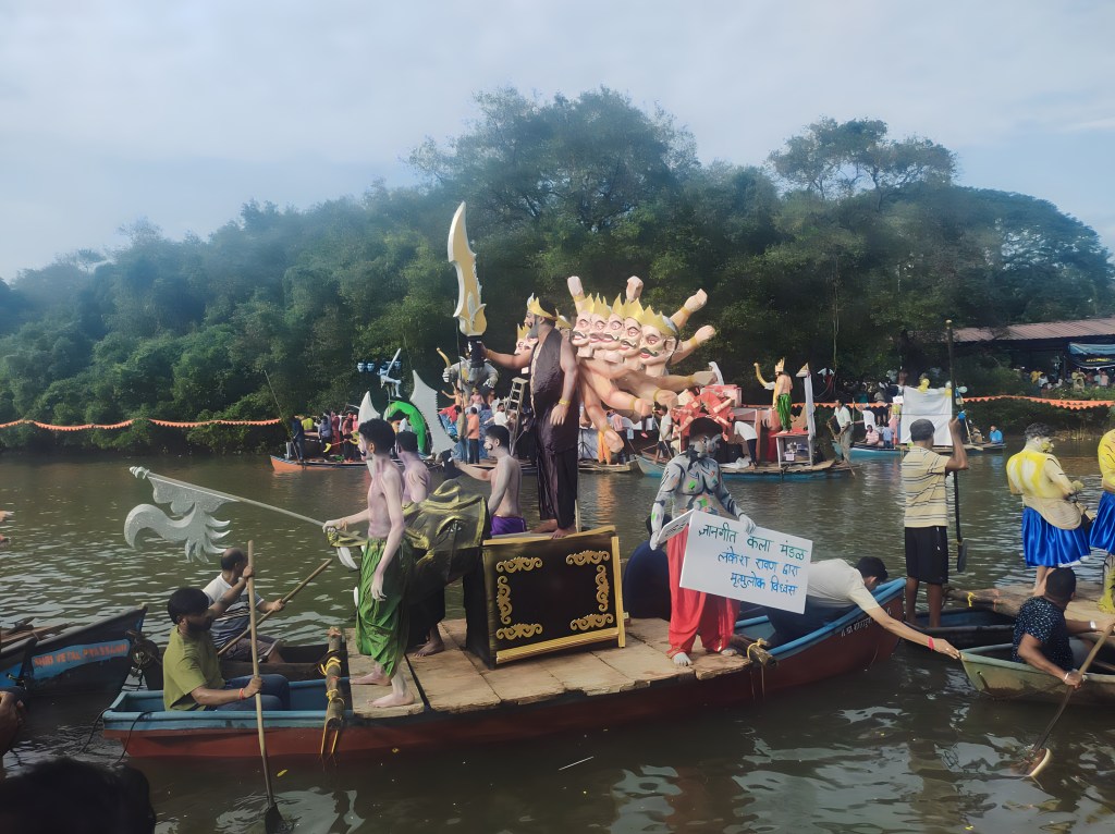 According to tradition, Devi’s Sangod is accompanied by a Bhat (priest), Jalmi (water carrier), Vajantri (musicians), temple committee members, and Katkar (the person who carries the pole). Approximately 15 Sangods, or canoes connected together, make seven rounds on a small river route. Only non-motorized canoes are permitted, and participants must use oars to propel their floats in the competition.